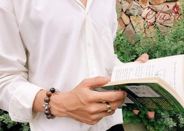 Vòng tay đá gỗ hoá thạch mix charm bạc khắc chú bình an luôn là sự lựa chọn hàng đầu của các khách nam nhà Tara